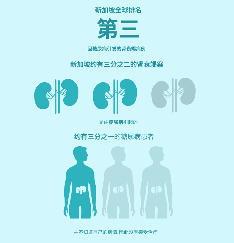 在新加坡, 糖尿病是肾衰竭的主要因素, 占了新病例的63%。 糖尿病是指人体抵制或不能产生胰岛素。当人体缺少胰岛素时, 血液中的葡萄糖或血糖水平就会升高。随着时间的推移, 肾脏中被称为肾小球的微小过滤单元将受到损害会损害。