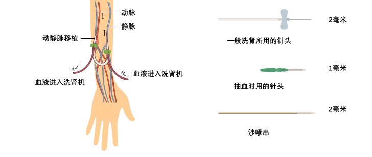 在洗肾开始前,要将两根针插入血管。一根针导出血液,另一根针则将滤净的血液输回体内。