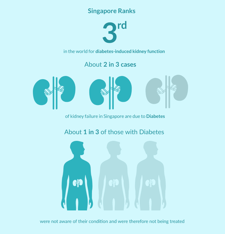 Diabetes is the number one cause of kidney failure in Singapore, accounting for 63% of new cases. Diabetes is a condition in which the body does not respond to insulin or is unable to produce insulin. When there is a shortage of insulin in the body and/or body resistance to insulin, the blood glucose level remains high. This can cause damage to the blood vessels in the kidney, as the nephrons have to work extra hard to filter the blood. Over time, they become damaged and lose their filtering ability.