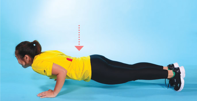 Bend your elbows to lower your body until your chest nearly touches the ground.