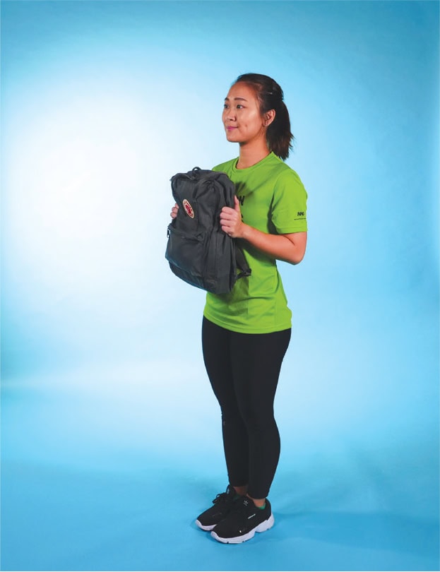 Feet together, hold the bag close to your chest. Make sure that straps are tightened such that the bag does not sag.