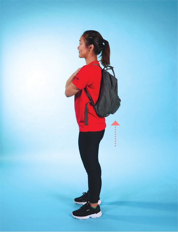 Stand upright with feet slightly wider than shoulder width and toes pointing forward. Carry your backpack normally.