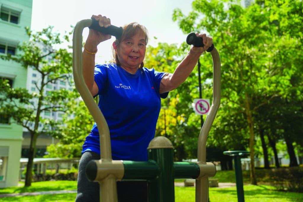 feels less tired and has a good appetite. She had a fall about three years ago and fractured her hip, but this did not deter her from continuing to keep fit after her recovery. She continues to try her best to stay physically active by using the fitness equipment at the park near her home, as well as following exercises on YouTube and simple workout tips given by NKF’s exercise specialist for her to do at home. Living with her sister who works, Mdm Lee helps out with the grocery shopping and does simple cooking to keep herself busy and mentally alert. She is happy that she can lead a simple, normal and active life.