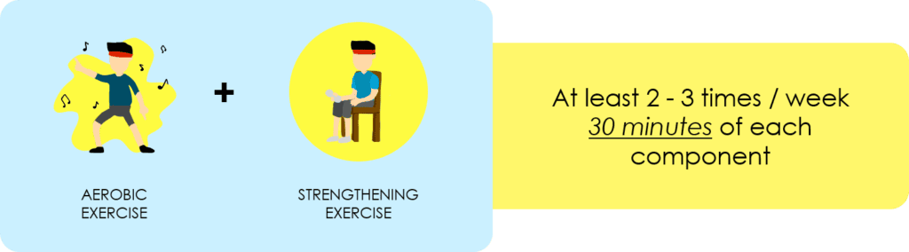 Patients should begin with low impact exercises such as walking to build their fitness level before increasing the intensity. After which, activities such as cycling, Zumba and aerobics can inject some variety in an exercise program.