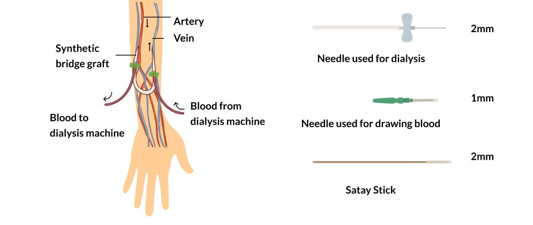 Before dialysis begins, 2 needles will be inserted into the vascular access, one to remove the blood and the other to return cleansed blood to the body.